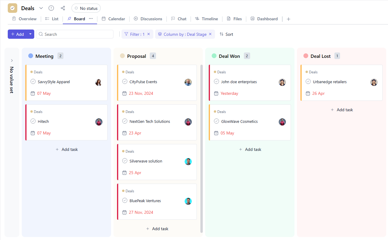 * Track **deal value**, **expected close dates**, and **assigned reps**.