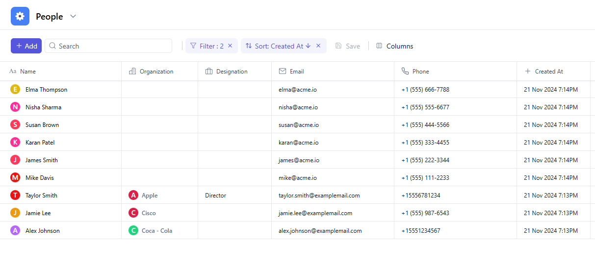 * Store details like company name, contact person, phone numbers, emails, and **custom fields**.